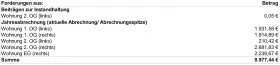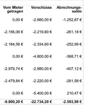 Die einzelnen Werte stellen das Ergebnis aus dem umlagefähigen Kosten auf den Mieter abzgl. des Betrages der Hausgeldabrechnung dar.