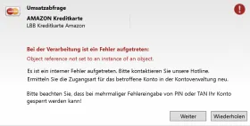 Ich hatte den Fehler schonmal und konnte damals mit einem Update des LetsTrade Kernels den Fehler beheben. Die aktuelle Kernel-Version zeigt auch eine Fehlerbehebung in Verbindung mit dem Amazon Kreditkartenkonto in den Release Notes. Die Installation hat aber dennoch nicht geholfen.