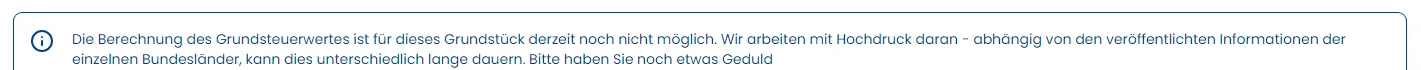Die Berechnung des Grundsteuerwertes ist für dieses Grundstück derzeit noch nicht möglich. Wir arbeiten mit Hochdruck daran - abhängig von den veröffentlichten Informationen der einzelnen Bundesländer, kann dies unterschiedlich lange dauern. Bitte haben Sie noch etwas Geduld