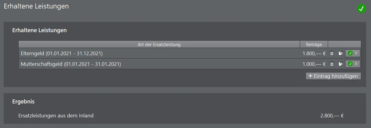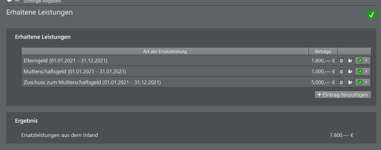 - wenn man es nicht unter "Erhaltene Leistungen" aufführt, so fehlt der Betrag in dem Vordruck der "Formulare" (Hauptvordruck, Seite 2, Feld 43) - er wird aber aus der importierten LSB für die Erstattung bereits benutzt