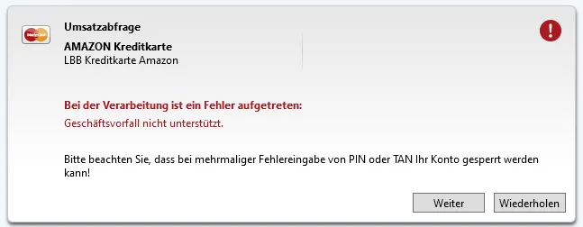 AMAZON Kreditkarte / Geschäftsvorfall wird nicht unterstützt mit PreRelease 5.2.1.127