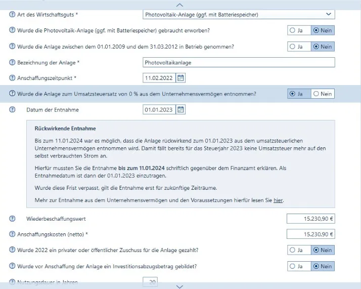 Ich habe 2023 mit Datum 24.04.23 die Entnahme der PV-Anlage zum Nullsteuersatz gemeldet. Im 1. Quartal habe ich eine Umsatzsteuerrückvergütung für die verspätete Endabrechnung der PV-Anlage erhalten und die unentgeltliche Wertabgabe entrichtet. Das habe ich unnötigerweise auch in den restlichen Quartalen des Jahres getan.