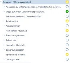 ich verwende Wiso Steuer 2023 und würde einzelne Themen gerne als erledigt markieren mit einem grünen Häckchen (z.B. den Punkt "Reisekosten" bei den "Werbungskosten"). Wenn ich beim jeweiligen Thema etwas eintrage wird das grüne Häckchen gesetzt und bleibt im Übersichtsbaum links erhalten (wie bei der Entfernungspauschale im folgenden Bild):