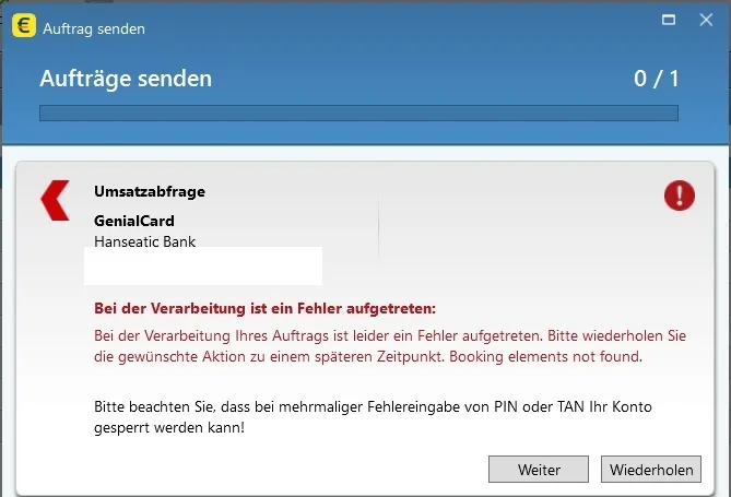 Als ich danach aber die Umsätze abfragen wollte, hat es zum einen sehr lange gedauert und mit folgender Fehlermeldung "Booking elements not found" geendet.