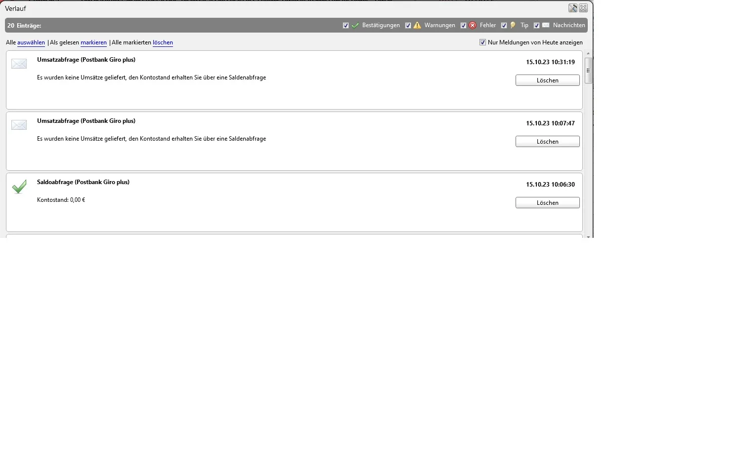 15. Oktober 2023 um 10:55 Hat den Titel des Themas von „Pstbank Giro plus Umsatzabfrage“ zu „Postbank Giro plus Umsatzabfrage“ geändert. -