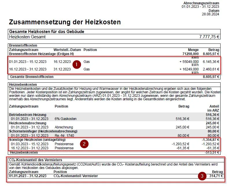 Wenn für ein Abrechnungsjahr mindestens 2 Brennstoffkosten, in meinem Fall Gaskosten vom 1.1.-15.12.23 und 16.12.-31.12.23, vorliegen und diese Kosten entsprechend den Angaben in der jeweiligen Rechnung einbucht, dann werden die Kosten und Aufteilung der CO2 auf Seite 3 falsch berechnet. Diese Feststellung hatte ich bereits kurz nach dem Update an den Support gemeldet.