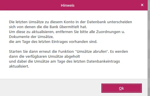 Hab seit Montag das Problem, dass die Umsätze-Zuordnungen von letztem Tag gelöscht werden müssen, damit Abruf funktioniert!