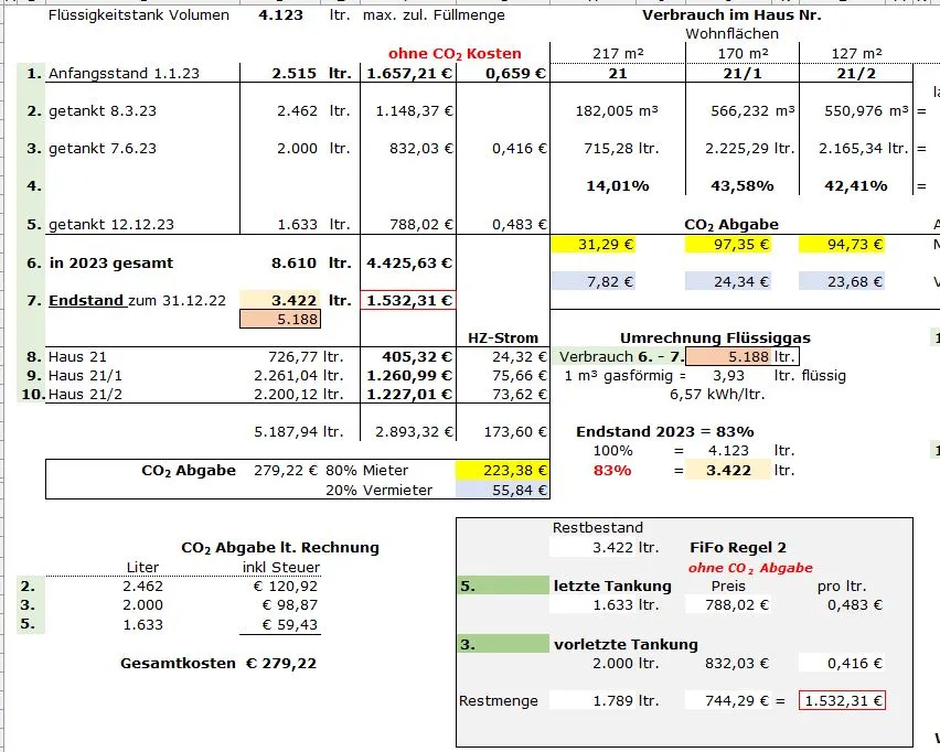 Es gibt einen Flüssiggas-Tank mit einem Gesamtvolumen von 5.500 ltr, welcher in der Regel 2x im Jahr auf maximum gefüllt wird. An dem Gas-Tank sind 3 Parteien, die den Verbrauch über jeweils eigene Zähler in m³ messen. Die Wartung des Gas-Tankes teilen sich die 3 Parteien anteilig zu je 1/3.