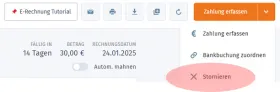 Die bestehende Rechnung (...noch nicht beglichene) wird im Wiso Mein Büro-Rechnungen aufgerufen und dann über Zahlungen erfassen storniert. Es entstehen zwei Vorgänge, einmal Storno mit positiven Betrag und einmal Storno (als bezahlt) mit negativen (minus) Betrag, die in der Rechnungsaufstellung als solche, auch zu sehen sind. Die Stornorechnung nimmt Bezug (...alte Rechnungsnummer) auf die zuvor erstellte Rechnung. Bei Bedarf muss eine komplett neue Rechnung mit neuer Rechnungsnummer erstellt werden.