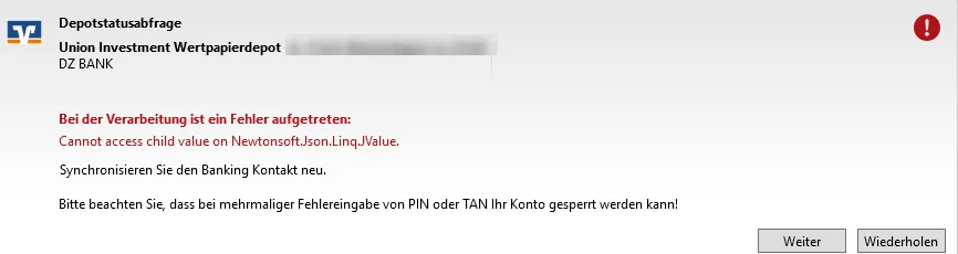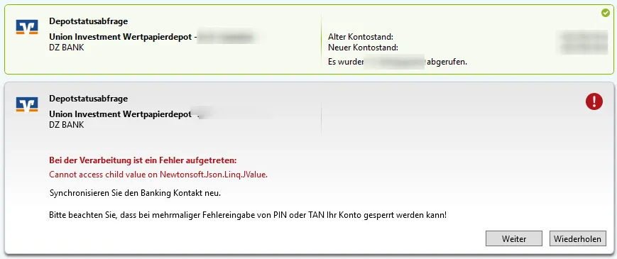 Öffnen Sie nun bitte das Programm und prüfen Sie die Abfrage des betroffenen Kontos.Leider funktioniert diese Fehlerbehebung interessanterweise nur bei einem Konto. Beim Konto meiner Frau kommt eine Fehlermeldung, wobei ich bei beiden Konten das exakt gleiche gemacht habe. Bekomme beim zweiten Konto wieder die bereits zuvor zitierte Meldung: