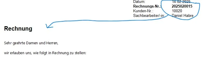 Jetzt möchte ichm wie im o.a. Bild die Rechnungsnummer nicht nur rechts in klein angeben, sondern auch in Gross neben die Überschrift RECHNUNG einfügen, damit die Kunden das besser sehen und bei der Zahlung angeben.