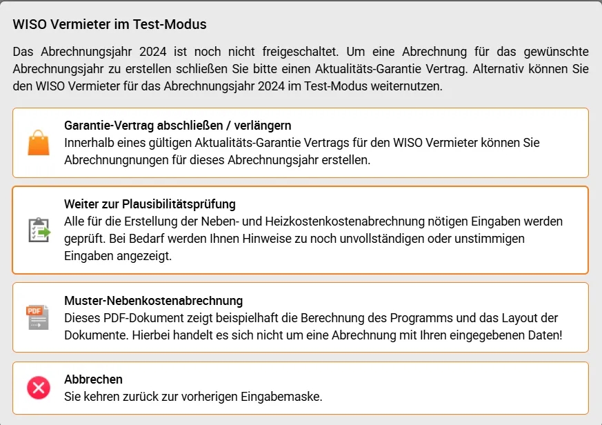 Das Abrechnungsjahr 2024 ist noch nicht freigeschaltet. Um eine Abrechnung für das gewünschte Abrechnungsjahr zu erstellen schließen Sie bitte einen Aktualitäts-Garantie Vertrag. Alternativ können Sie den WISO Vermieter für das Abrechnungsjahr 2024 im Test-Modus weiternutzen.