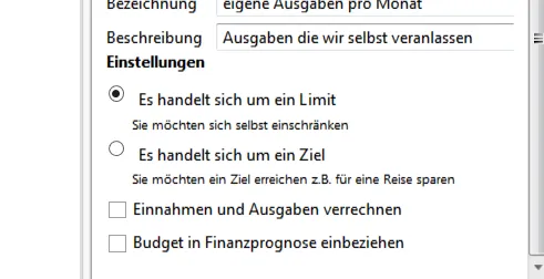 ich möchte die Budgetfunktion etwas intensiver nutzen habe aber das Problem, dass die Einbeziehung des Budgets in die Finanzprognose nicht auch für ein bestimmtes Konto angewendet werden kann. Das Budget wird momentan auf ein Girokonto angewendet welches ich zuerst angelegt hatte. Aber das ist nicht unser Konto mit dem ich ein Budegt verwalten möchte. Wie kann ich MG dazu bringen ein bestimmtes Konto zu nutzen. Hier der Bereich wo der Haken gestetzt werden muss um das Budget in die Finanzplanung einbeziehen zu können.
