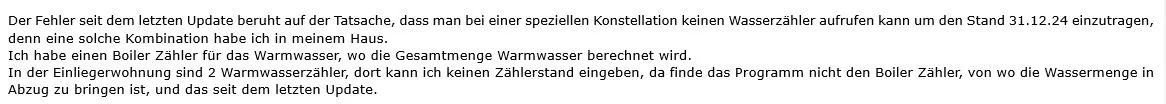 Komisch ist das, da die, die eine solche Konstellation haben jetzt sich etwas einfallen lassen müssen, denn die eigenen Abrechnungen können so nicht mehr durchgeführt werden. Ich habe einen Versuch unternommen, mittels Excel Tabelle (und das nur, weil der Hausverwalter das nicht mehr macht!) die einzelnen Zähler eintragen, die Stände berechnen um dann einen fiktiven (!) Zählerstand des Boiler Zählers eintragen muss, sonst stimmt das Verhältnis einmal nicht bei dem Verbrauchszahlen, zum anderen muss der Eigentümer/Mieter erhöhte Wasserkosten bezahlen. Eine unmögliche Konstellation was sich die Softwareartisten haben einfallen lassen. Unglaublich, das hat seit Jahres funktioniert, und jetzt!