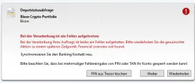 Es wird zwar von der Solaris-Bank per SMS ein Freigabecode geliefert, aber WISO MG bringt eine Fehlermeldung (Anlage).