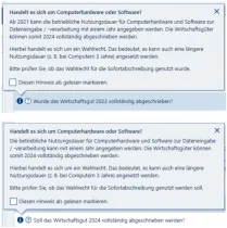 Bei Eingabe taucht immer wieder die Meldung auf. Kann man in der Gesamtabschreibungstabelle grundsätzlich unterschiedlich entscheiden - entweder für 1) mehrere Jahre ansetzen und wiederum gleichzeitig für andere Einträge wo ich mich für 2) Sofortabschreibung entscheide oder darf die Tabelle für sämtliche Wirtschaftsgüter entweder nur 1) oder 2) enthalten?