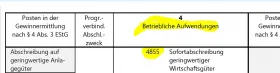Geringwertige Wirtschaftsgüter (GWG) mit einem Betrag unter 250,01 € dürfen sofort abgeschrieben und somit direkt als Betriebsausgabe oder mit der Kategorie 4855/6260 Sofortabschreibung erfasst werden.