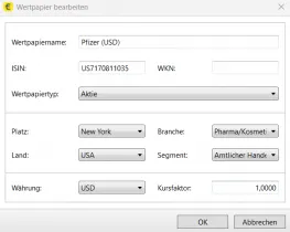 Ich habe Pfizer als Wertpapier mit Währung USD und Umrechnungsfaktor 1 angelegt.