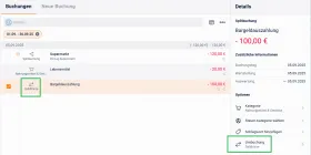 Ich habe also eine Buchung von 120€, bestehend aus 20€ Lebensmittel und 100€ Bargeldauszahlung, die in meine Geldbörse wandert.