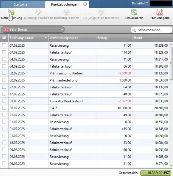 Nachdem der Zugang zum BahnBonus-Konto nicht mehr gefixt/aktualisiert wird führe ich das Konto manuell weiter, damit ich regelmäßig daran erinnert werde zeitgerecht meine Punkte zu verbraten.