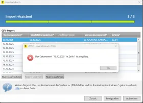 Wenn ich auf den Button "Fertigstellen" klicke, dann erhalte ich die Fehlermeldung: "Der Datumswert "13.10.2025" in Zeile 1 ist ungültig.