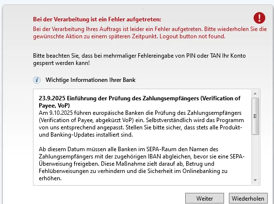 19. Oktober 2025 um 14:32 #1 Bei mir funktioniert es weiterhin nicht, mittlerweile erhalte ich auch eine andere Fehlermeldung "Logout button not found".Jemand selbige Nachricht schon mal erhalten?