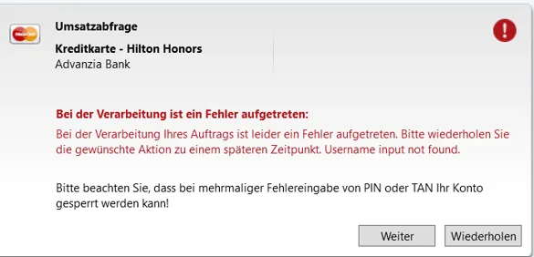 Hilton/Advanzia-Kreditkarte Umsatzabruf geht nicht mehr