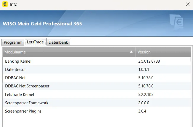 Alles klar. Deine LetsTrade-Version ist total veraltet. Du solltest die mal wieder updaten (ist das bei Dir deaktiviert?). Entweder über die Programmfunktion oder auf dem kurzen Dienstweg über den LetsTrade PreRelease (aktuell die Version 5.2.2.120).