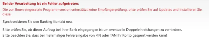 Ärgerlich und für mich nicht plausibel, aber seit dem funktioniert es wenigsten wieder mit der Überweisung und der damit verbundenen Empfängerüberprüfung
