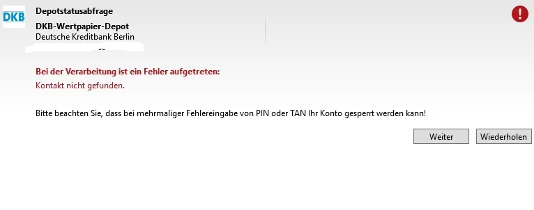 Plötzlich klappt der Abruf des DKB-Depots nicht mehr mit folgender Fehlermeldung: