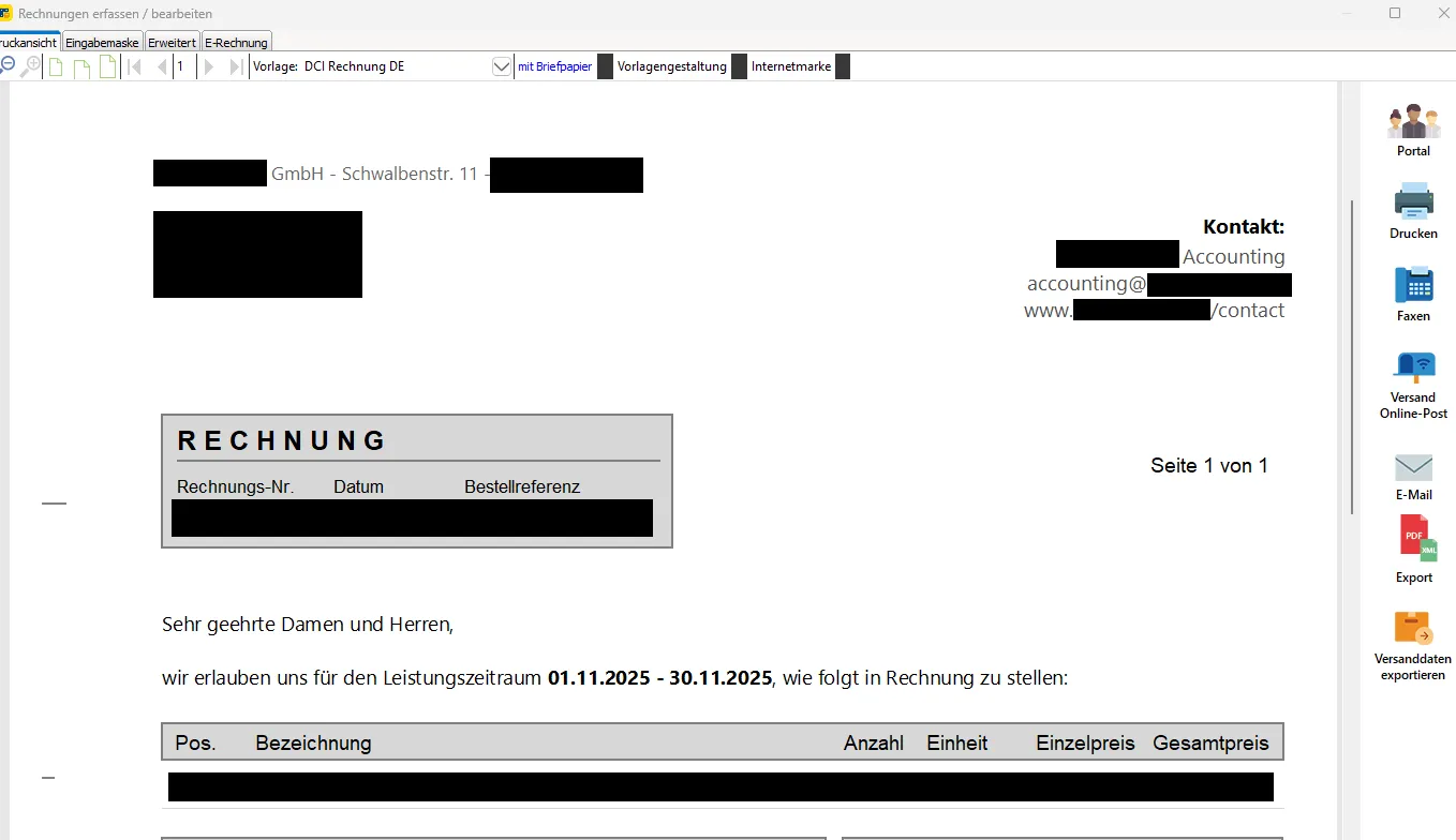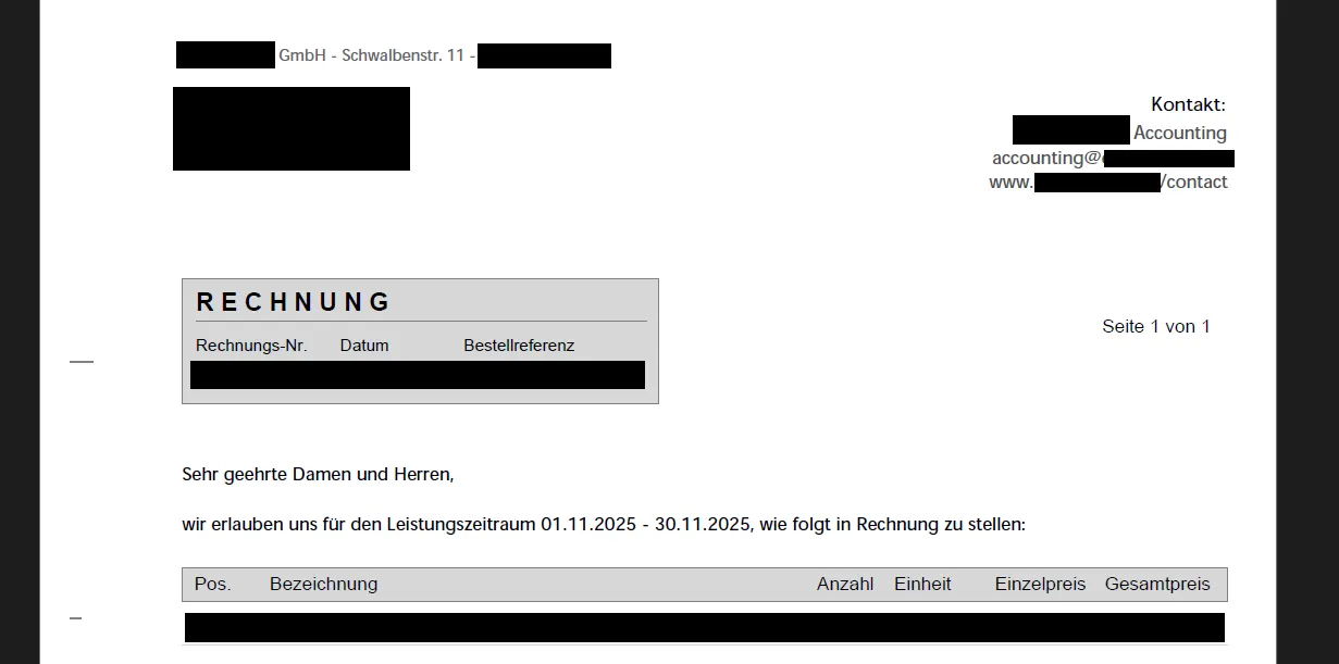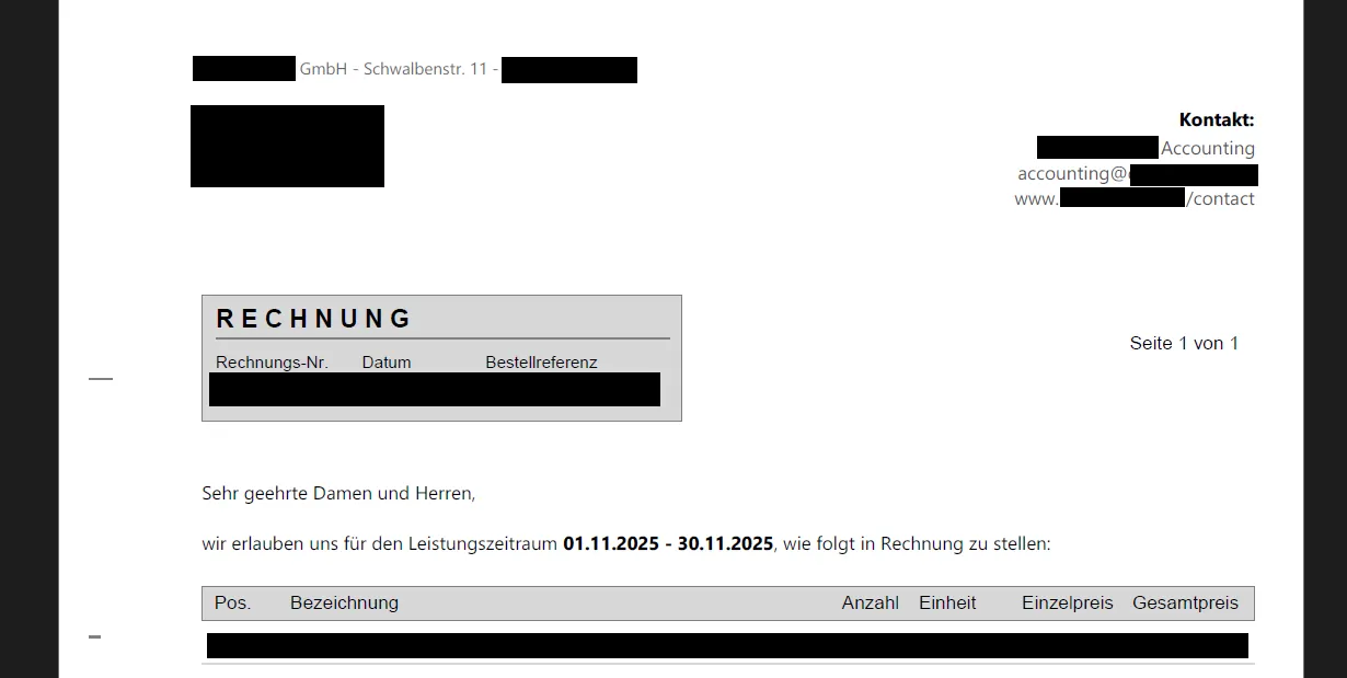 Das Komische ist, dass selbst in der falschen Darstellung in der E-Rechnung das Verhalten nicht Mal einheitlich ist, da in einer weiteren Rechnung für einen englischsprachigen Kunden die Formatierung z.B. des Einleitungstextes wieder anders aussieht - hier wurde der Leistungszeitraum zum Beispiel korrekt in Fett-Schrift ausgedruckt, aber auch hier gibt es wieder Abweichungen zum eigentlichen Layout, z.B. wieder andere Schriftart im Informationsbereich.