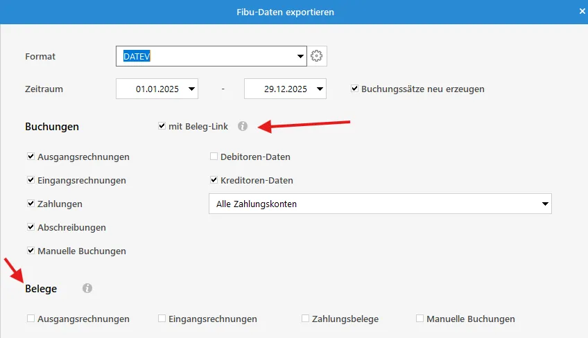 Seit heute erstellt mir der Fibu Export aber nur noch die .csv Datei und ich finde auch keine weitere Einstellung um auch wieder die Belege zu erzeugen.