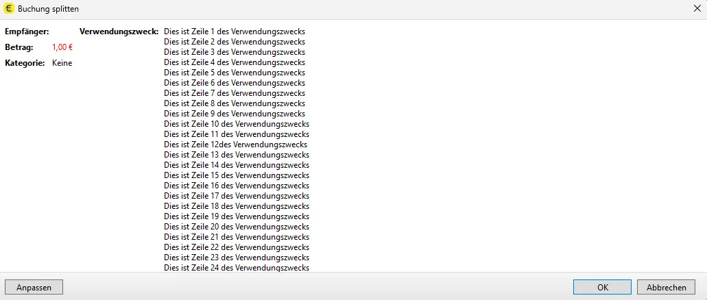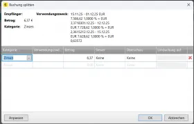 Statt des Split-Dialogs kommt dann eine Maske "Anpassen", bei dem man die Buchung anpassen kann, was ich aber natürlich nicht will.