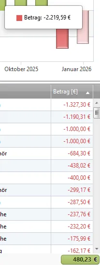 D.h., nur wenn der Monat Januar 2026 in der linken Monatstabelle ausgewählt ist und nicht nur in der Graphik sein Wert per Mouseover angezeigt wird, nur dann muß auch unterhalb der Buchungstabelle der Januarwert in der Summe stehen.