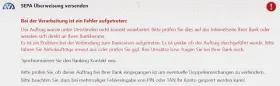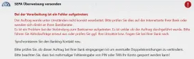 Wenn ich aber Geld vom Tagesgeldkonto auf mein Referenzkonto überweisen will, dann erscheint nach der Freigabe durch pushTAN bzw. PhotoTAN folgende Fehlermeldung und die Überweisung wird nicht ausgeführt.