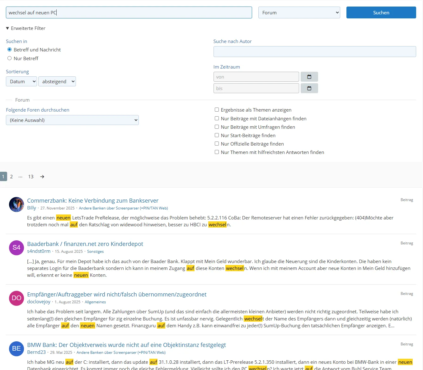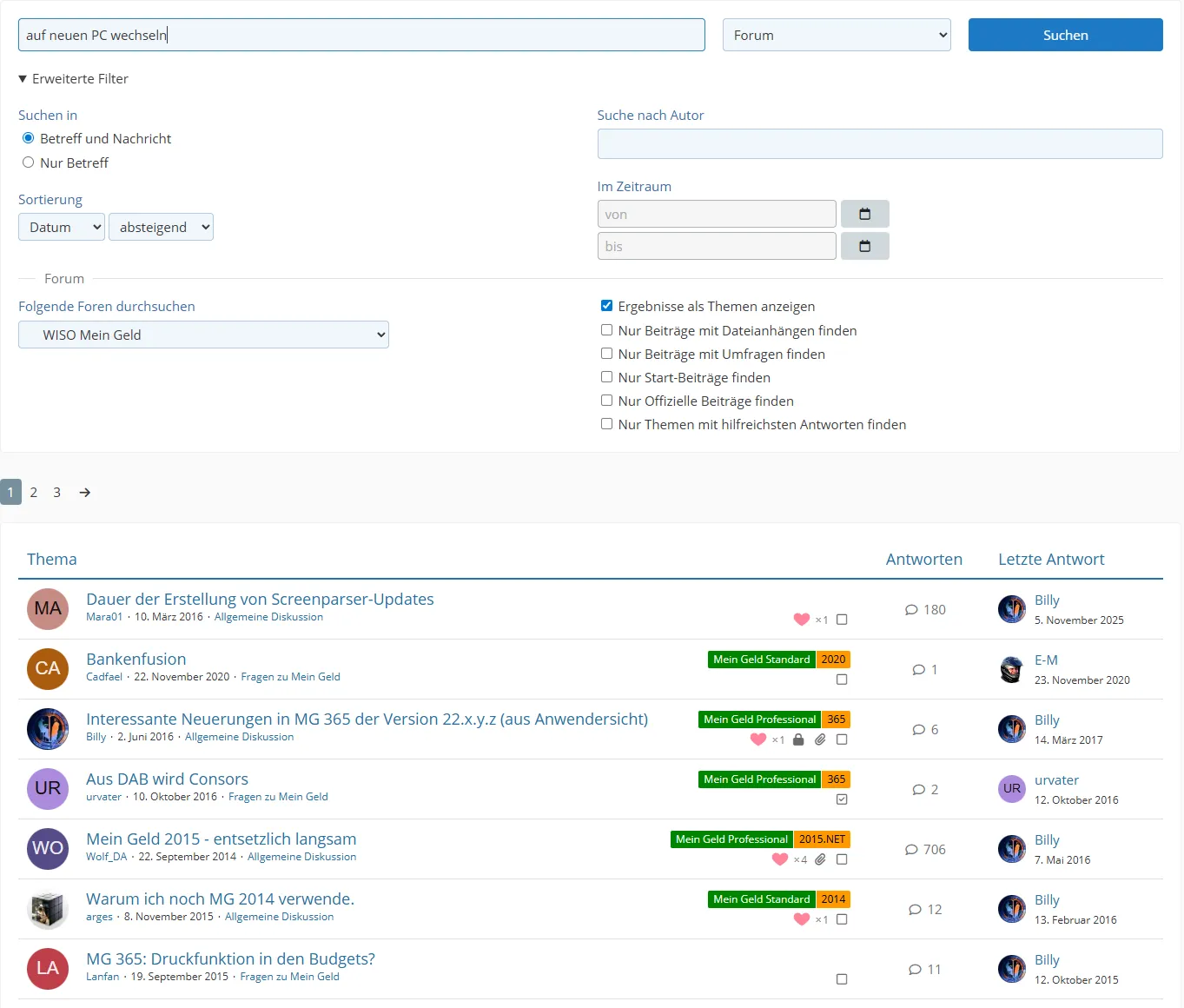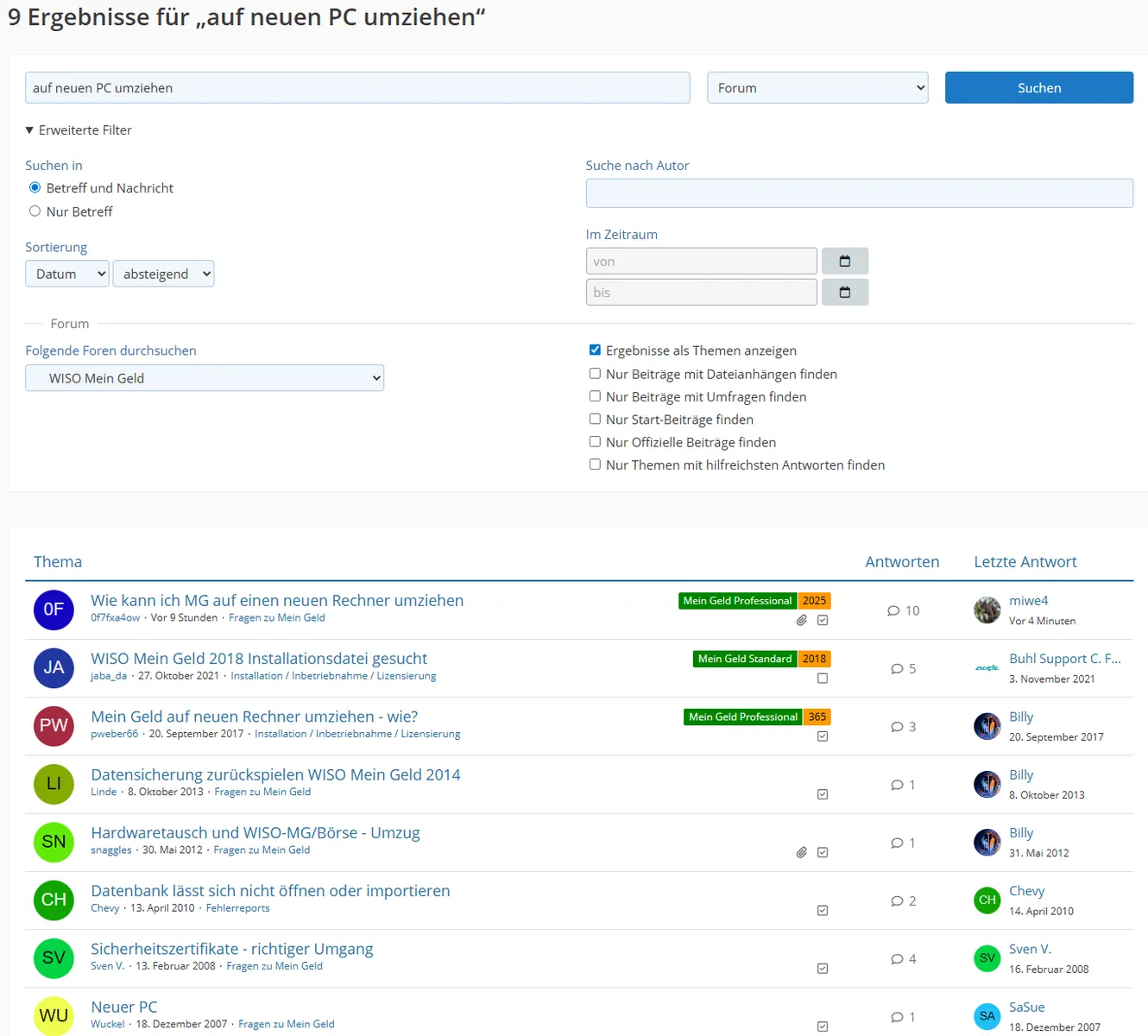 Du meinst die Forumssuche. Und deren Antwort hängt davon ab, was Du wo mit welchen Suchkriterien anfragst. Da muß man auch etwas "kreativ" sein, also statt "Umzug" auf "Wechsel" etc. nutzen. Und was für Mein Geld gilt, gilt - wenn es die Funktion gibt - auch für die anderen Programme der Programmfamilie (Konto Online, Haushaltsbuch) und umgekehrt.