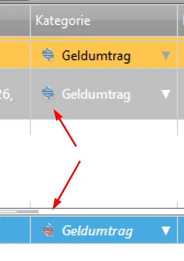 Wo kommt der blaue recht/links Pfeil bei "Buchungen" in der Spalte Kategorie bei erkannten Umbuchungen her? Und was könnte es bedeuten, wenn der obere Pfeil nach rechts blau ist und der untere nach links rot?