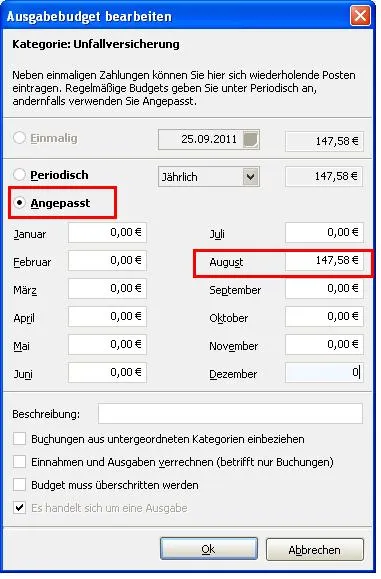 Im Januar kommt z.B. die Autoversicherung, dann im ganzen Jahr nicht mehr. Im Moment teilt MG den Wert des Teilbudgets "Autoversicherung" durch 12. Mit dem Ergebnis, dass im Januar das Budget als überschritten markiert ist und den Rest des Jahres nicht. Das hat mit der Realität nicht mehr viel gemeinsam.