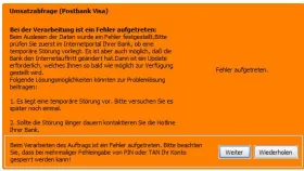 An fehlenden Umsätzen liegt es definitiv nicht. Ich habe regelmäßig Bewegungen auf meinem VISA-Konto. Die letzte problemlose Abfrage war bei mir am 20.11.2011 möglich, obwohl zwischenzeitlich mindestens ein weiterer Umsatz verbucht worden ist. Leider ist das Problem bislang nicht behoben. ![]()