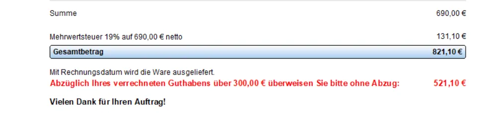 Hinweis auf Kundenguthaben im Schlusstext einer Rechnung -