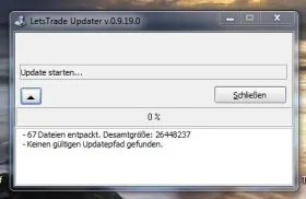 funktioniert leider nicht: Es erscheint ein Fenster "Lets Trade Updater v.0.9.19.0" und darin "update starten ...", nur tut sich nichts. Nach klick auf Button mit Pfeil darauf wird mitgeteilt, wie viel Dateien entpackt wurden, aber auch, dass kein gültiger Updatepfad gefunden wurde.