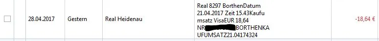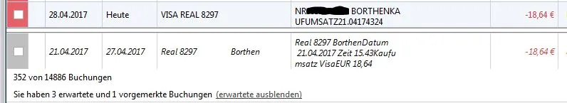 Wenn ich im Supermarkt z. B. am 21.04.2017; 17:43 Uhr (gemäß Kassenzettel) einen Einkauf mit meiner VISA-Karte bezahle und noch am gleichen Tag eine Umsatzabfrage durchführe, taucht in der Buchungsliste im Programm eine erwartete Buchung auf, in der als Wertstellung der 21.04.2017 und als Buchungsdatum der 27.04.2017 eingetragen ist. Im Verwendungszweck steht jedoch eine abweichende Zeit - im Beispiel "... Zeit: 15:43 ..."