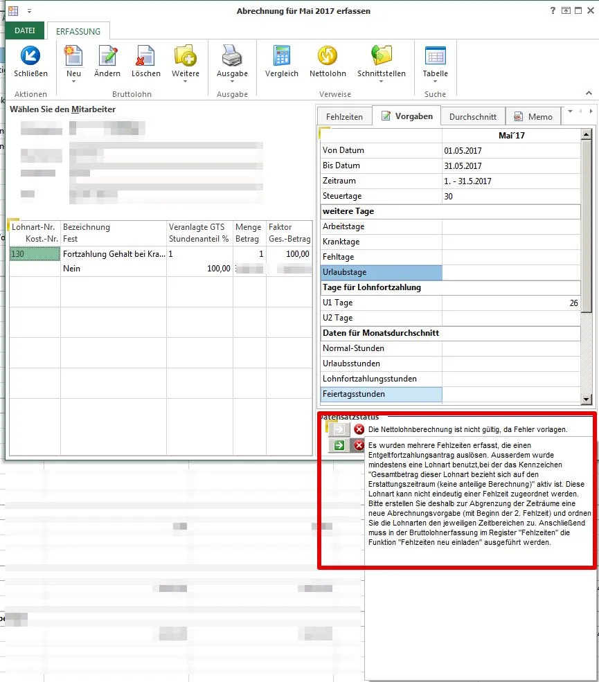 - Wenn ich den 26.5. eintrage und dann den Fall speichern möchte, kommt eine Fehlermeldung, dass die Dauer der Lohnfortzahlung auf max. 42 Tage beschränkt ist (bis zum 22.5.17), und dass ab dem 23.5. Krankengeld zu zahlen ist. Heisst das, dass ich die Abrechnung im Modul "Lohnkonto" für den Mai nur bis zum 22.5.17 mache? Was mache ich wenn der MA am 27.5. wieder gesund ist?