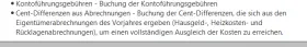- Cent-Differenzen aus Abrechnungen - Buchung der Cent-Differenzen, die sich aus den Eigentümerabrechnungen des Vorjahres (PS: statt Vorjahr müsste es doch Abrechnungsjahr heissen?") ergeben (Hausgeld-, Heizkosten- und Rücklagenabrechnungen), um einen vollständigen Ausgleich der Kosten zu erreichen."