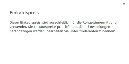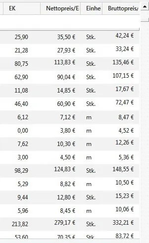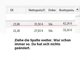 Im übrigen heißt es an der beschriebenen Stelle "Einkaufspreis des Lieferanten", der natürlich völlig unbekannt ist - wie ich schon vor langer Zeit geschrieben habe, nämlich als die Änderung des oben genannten statt fand. Es ist schon sehr traurig, daß man in einem solchen Programm keine Spalte für einen Einkaufspreis hat.