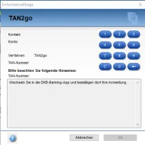 Es wird einmal zu Beginn, wenn alle Konten abgerufen werden, eine TAN verlangt - und tatsächlich wird über die TAN2go-App auch eine generiert. Danach werden beim Abrufen der einzenln Umsätze der jeweiligen Konten diverse Male Bestätigungen über die Banking-App angefordert - MG wartet auch brav, bis in der Banking-App die Bestätigung erfolgt ist. Sehr schön.