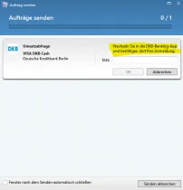 Der Dialog während der Umsatzabfrage weist korrekterweise darauf hin, dass man in die Banking-App wechseln soll und dort die Anmeldung bestätigen (gelb markiert). Buhl weiß also sehr wohl was seitens DKB passiert, denn die Banking-App fordert mich in dem Moment auch dazu auf!