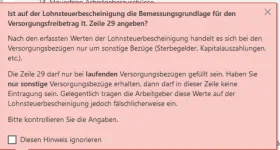 mein Vater ist letztes Jahr verstorben, er war Beamter und bekam Bezüge vom Landesamt für Besoldung und Versorgung (LBV). Meine Mutter erhält eine Altersrente und weiterhin als Witwe Hinterbliebenenbezüge durch das LBV. Im elektronischen Bescheid des LBV wird bei der Lohnsteuerbescheinigung unter "Zeile 29" der Betrag X bei "Bemessungsgrundlage für den Versorgungsfreibetrag" ausgewiesen. Nun kommt es zur Kollision mit der angegebenen Berufsgruppe "Angaben zur Beschäftigung".