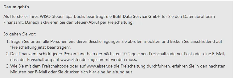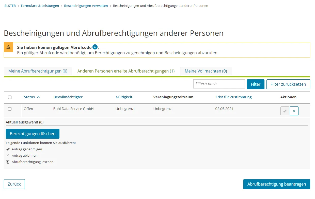 Ich habe meine Daten angegeben und abgeschickt. Da ich bereits auf ELSTER freigeschaltet bin, habe ich mich da eingeloggt und nachgeschaut. Folgendermaßen sieht das gerade aus: